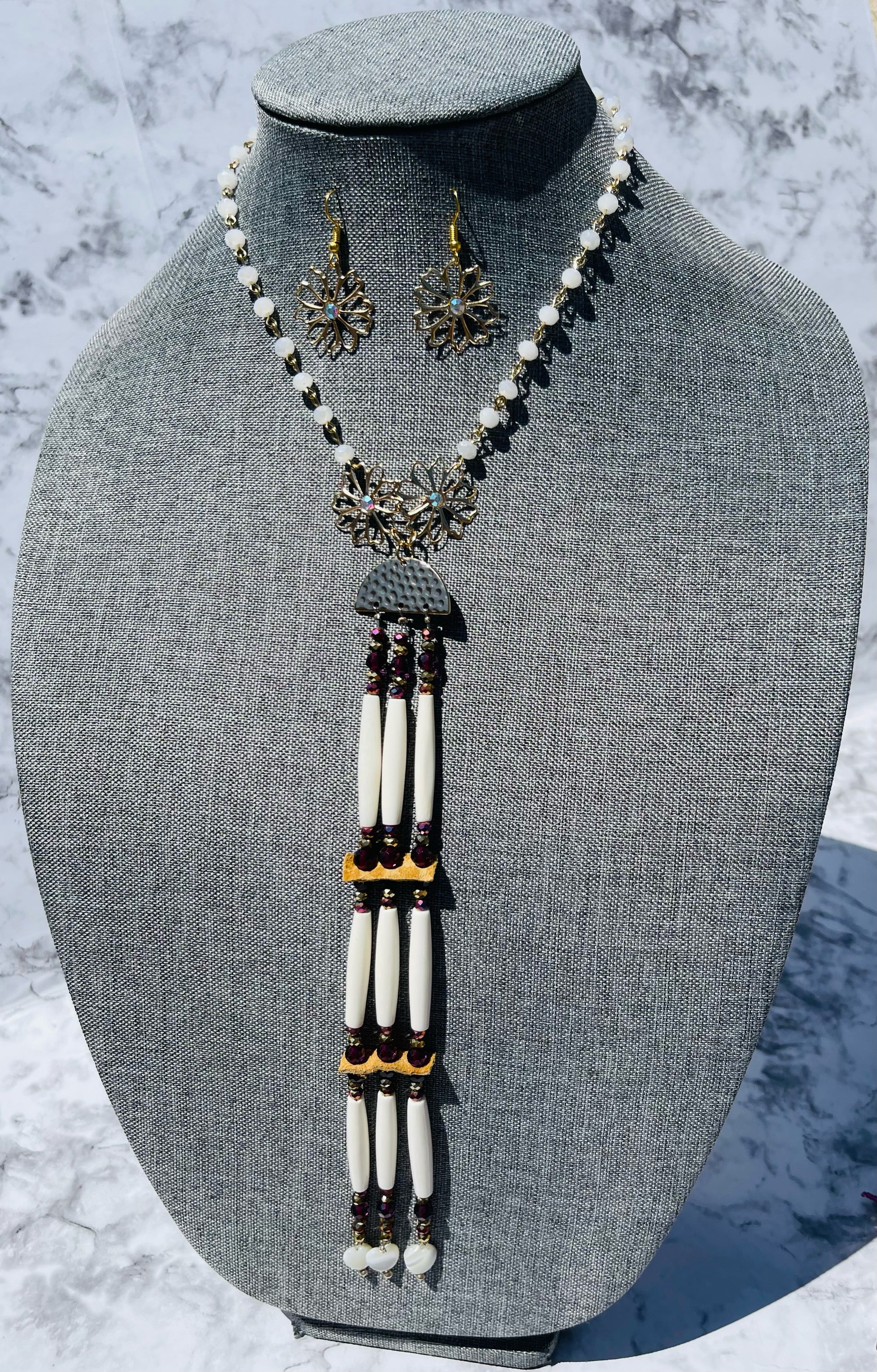 Indigenous White Bone Hairpipes Choker and Earring Set made for Royalty like you! Deep Purple, Iridescent Purple, Gold and White Hairpipes make for a beautiful set especially with Mother of Pearl and Crystal Accents. These colors are a perfect match for everyday errands, or spice up your work attire or add some glimmer to your night out on the town. For this beaded Choker I used beautiful White Bone Hairpipes, Glass and Crystal Beads, Mother of Pearl Heart Beads, and Crystal accents. This Choker set will make for a beautiful gift! Ask about gift wrapping and card add on!