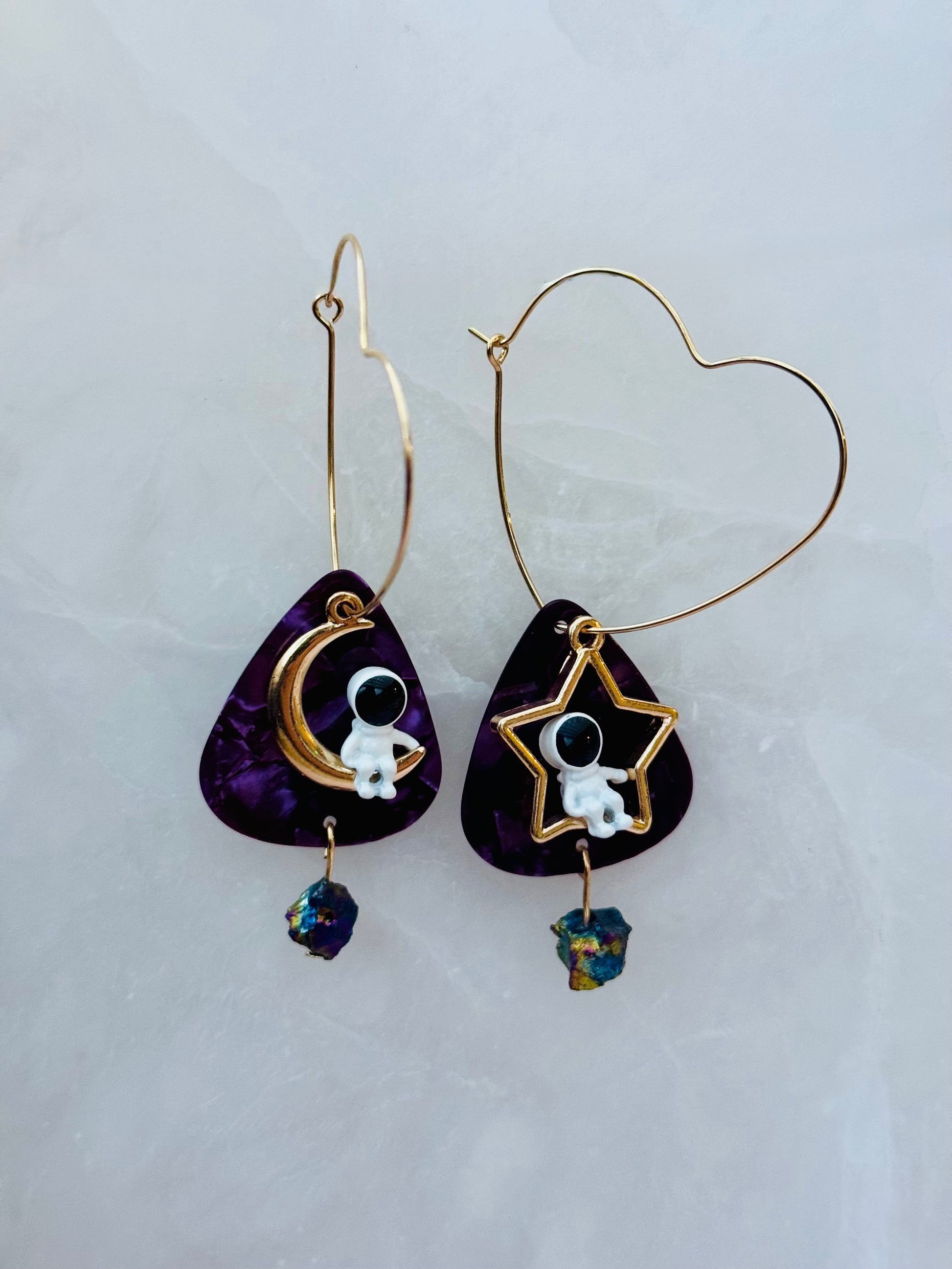 Space Cadet with Purple Guitar Picks and Rainbow Pyrite Heart Dangle Earrings